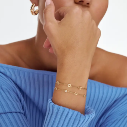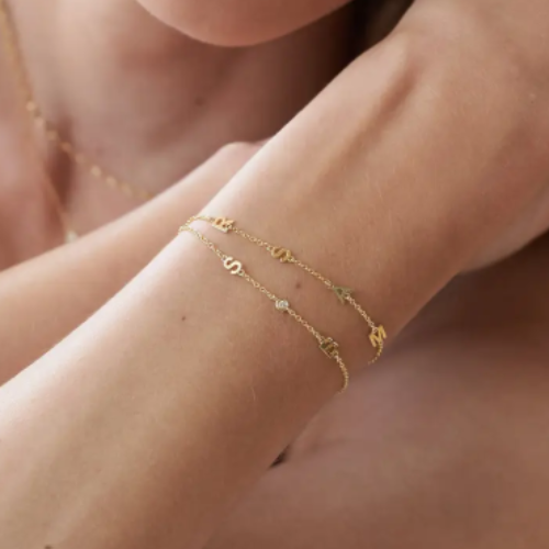 Crafted in 14K solid gold, this refined version of the Inez Initial Bracelet incorporates lab-grown diamonds for a luxurious touch. Available for £328, it blends modern sustainability with timeless elegance. The cable chain holds up to three customized letters, and you can add up to two diamonds to amplify its brilliance. Each diamond is lab-created, offering the same chemical properties as mined stones but with greater ethical value, an increasingly important factor in the world of customized jewelry.