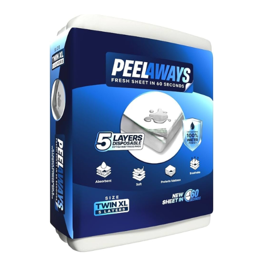 PeelAways sheets’ each layer is made from an exceptional blend of Bamboo, Rayon and Polyester fibers, which gives an optimum strength, absorption and softness. The mattress pad is disposable, which allows for quick cleanup, which means you don’t need to do laundry all the time.